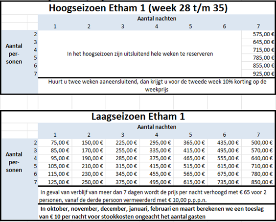 De huurprijzen zijn inclusief schoonmaakkosten, beddengoed en linnengoed. Handdoeken voor persoonlijk gebruik bieden we niet aan. Over de prijzen wordt niet onderhandeld.