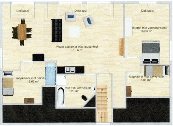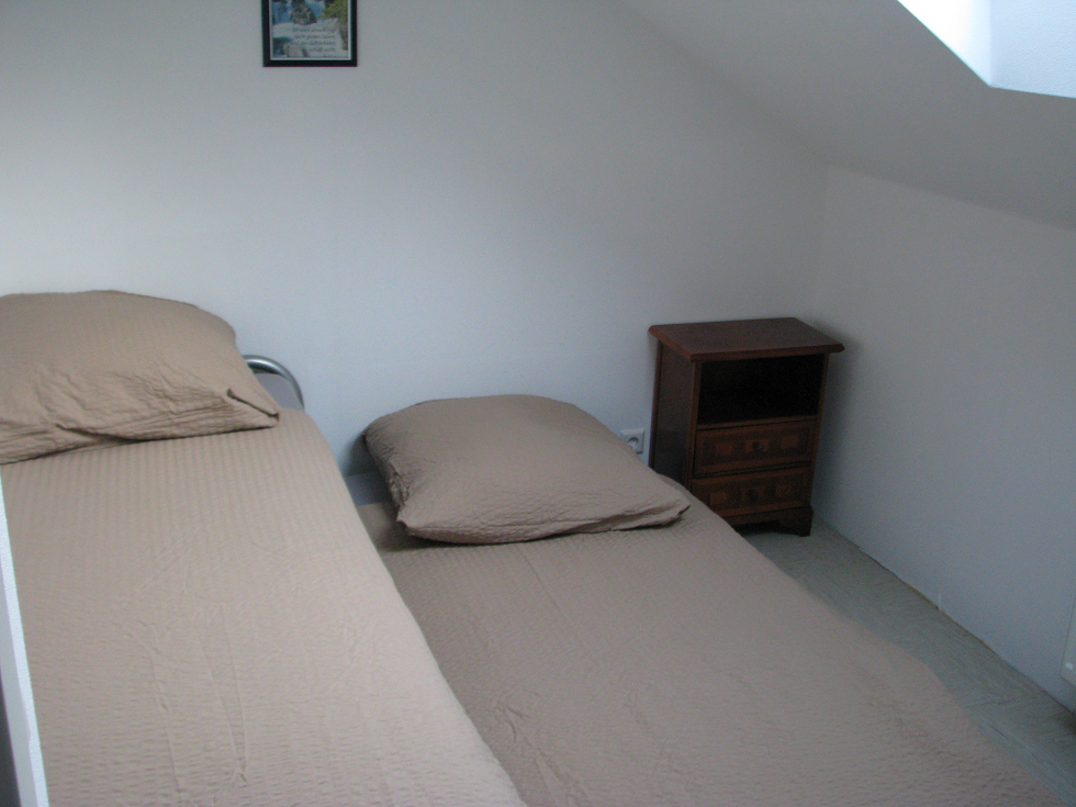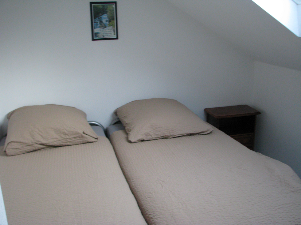 Rechts om de hoek van de trap is een garderobe, en vanuit die garderobe komt u ook in twee slaapkamers: Rechts een kleine slaapkamer met dakvenster, waar 1 vast bed in staat. Dit bed heeft nog een onderschuifbed, dat omhoog gesteld kan worden. Naar eigen keuze stelt u de bedden op met een tussenruimte, of aaneengesloten of met een hoogteverschil.