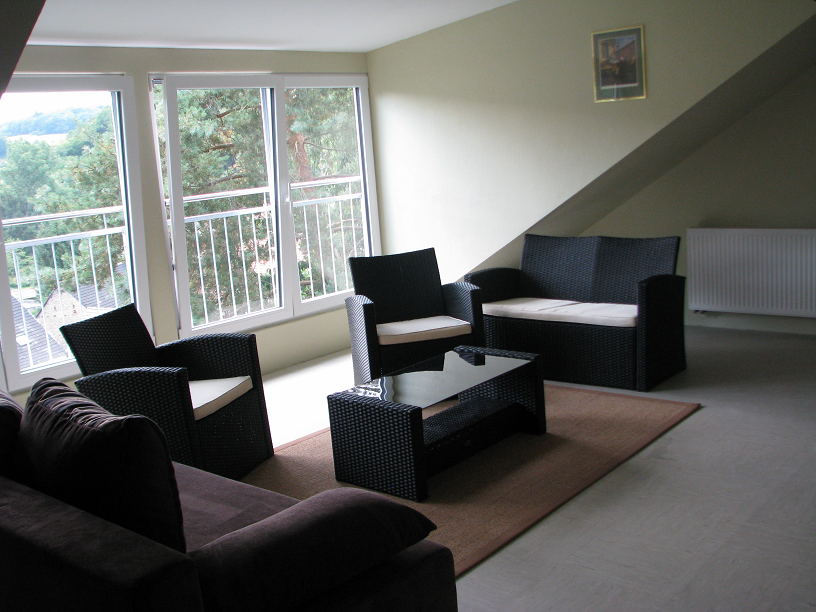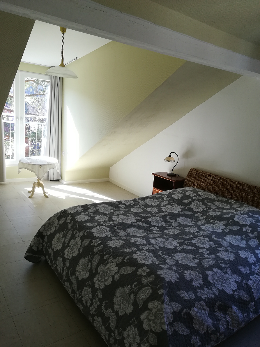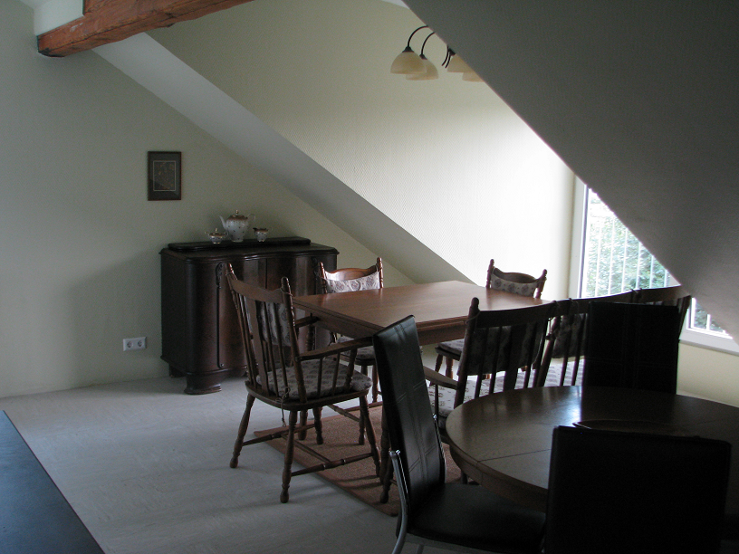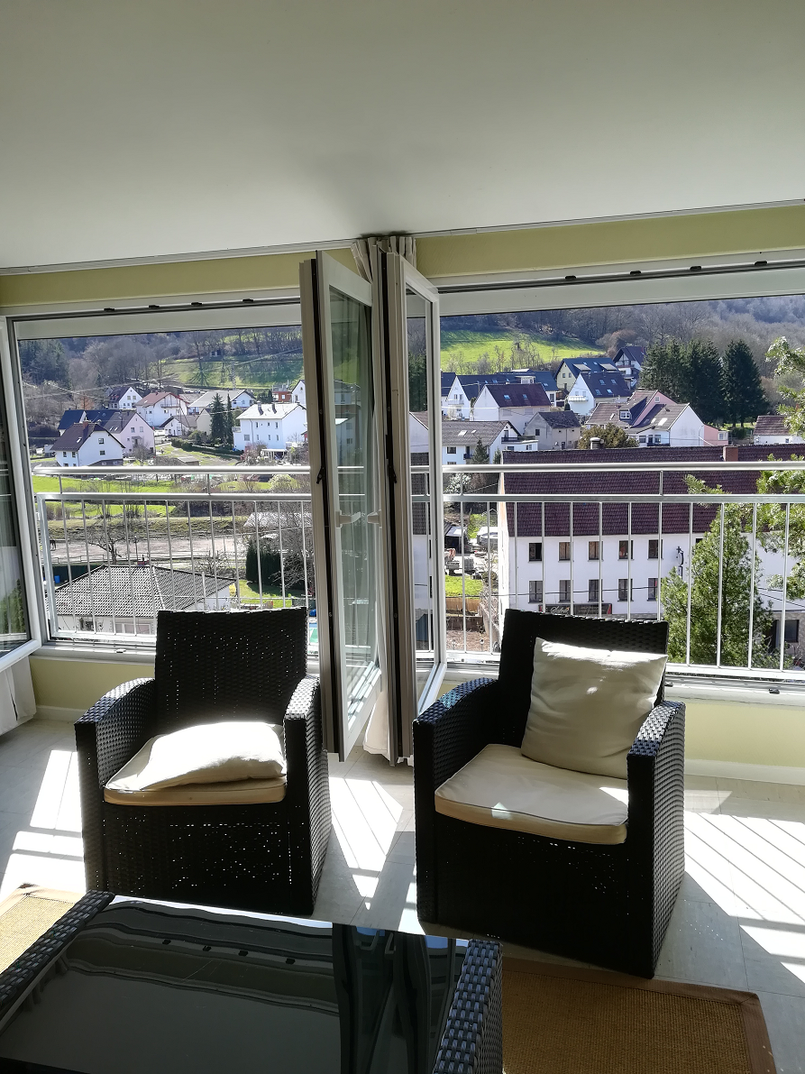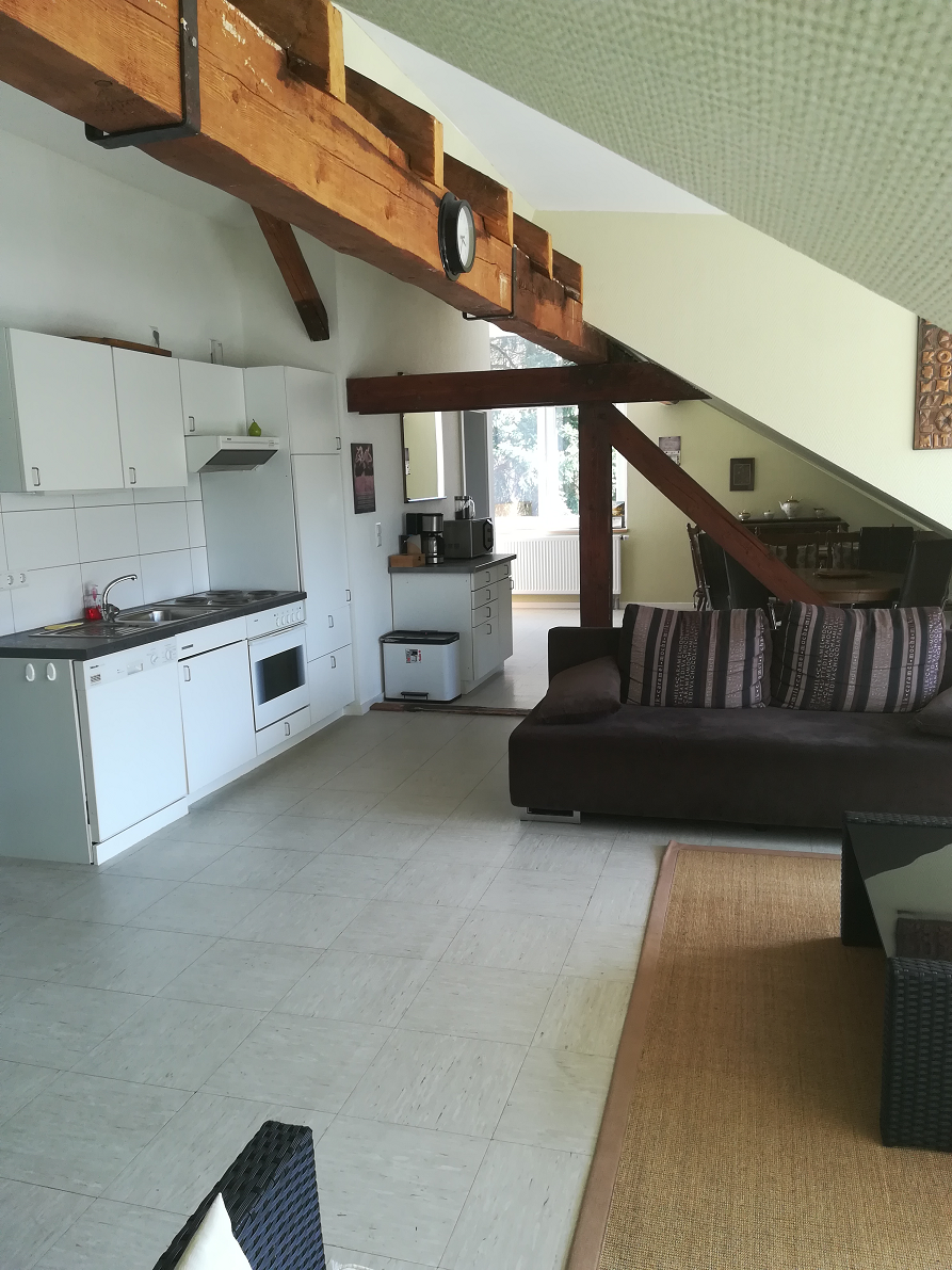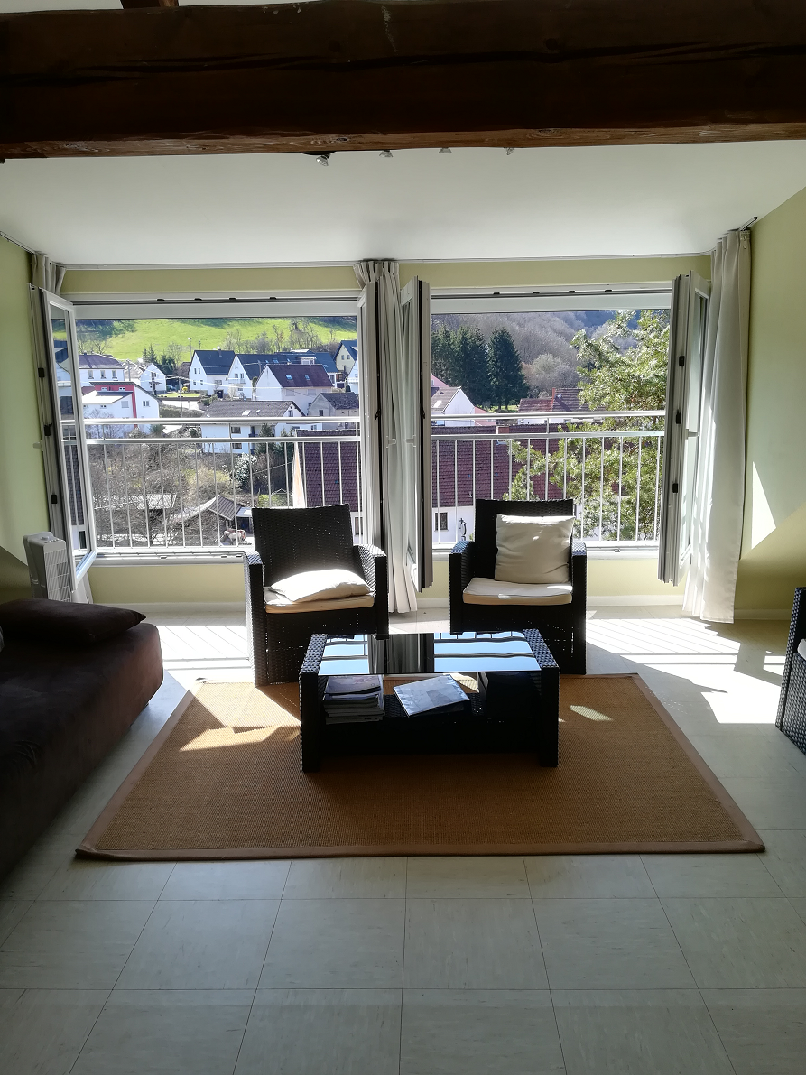 Over de lengte van het huis zijn aan de achterkant, die over het dorp uitkijkt, enkele grote dakkapellen aangebracht met grote openslaande deuren en franse balkons (de balustrade aan de buitenkant van het venster). Hierdoor heeft u een erg mooi uitzicht over het dorp Friedelhausen. De woning is geschikt voor 7 personen.
