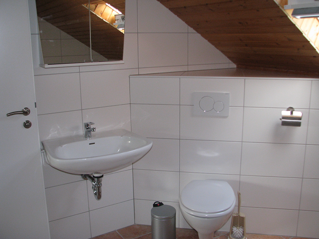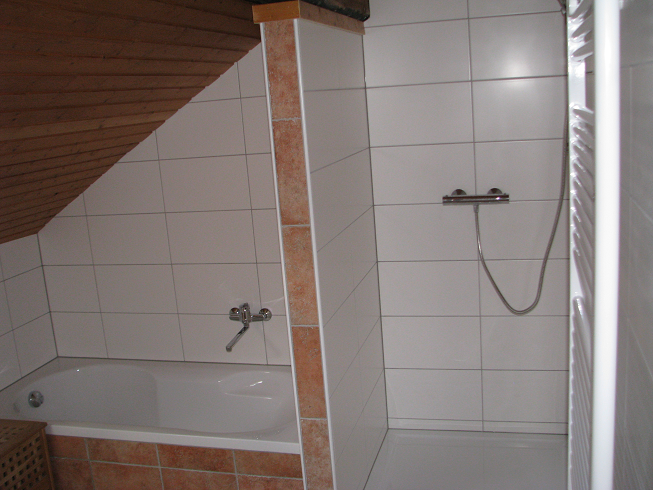 Gaat u terug naar de woonkamer, daar vindt u links van de trap de badkamer, met ligbad, wc, douche en wastafel.