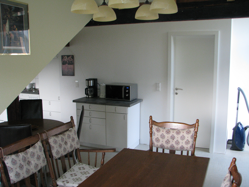Bovenaan de trap komt u via een (met slot afsluitbare) deur binnen in de woon-eetkamer met open keuken. Bij binnenkomst ziet u direct het uitzicht vanuit de woning, want u kijkt vanaf de hoge plaats neer op het dorp.